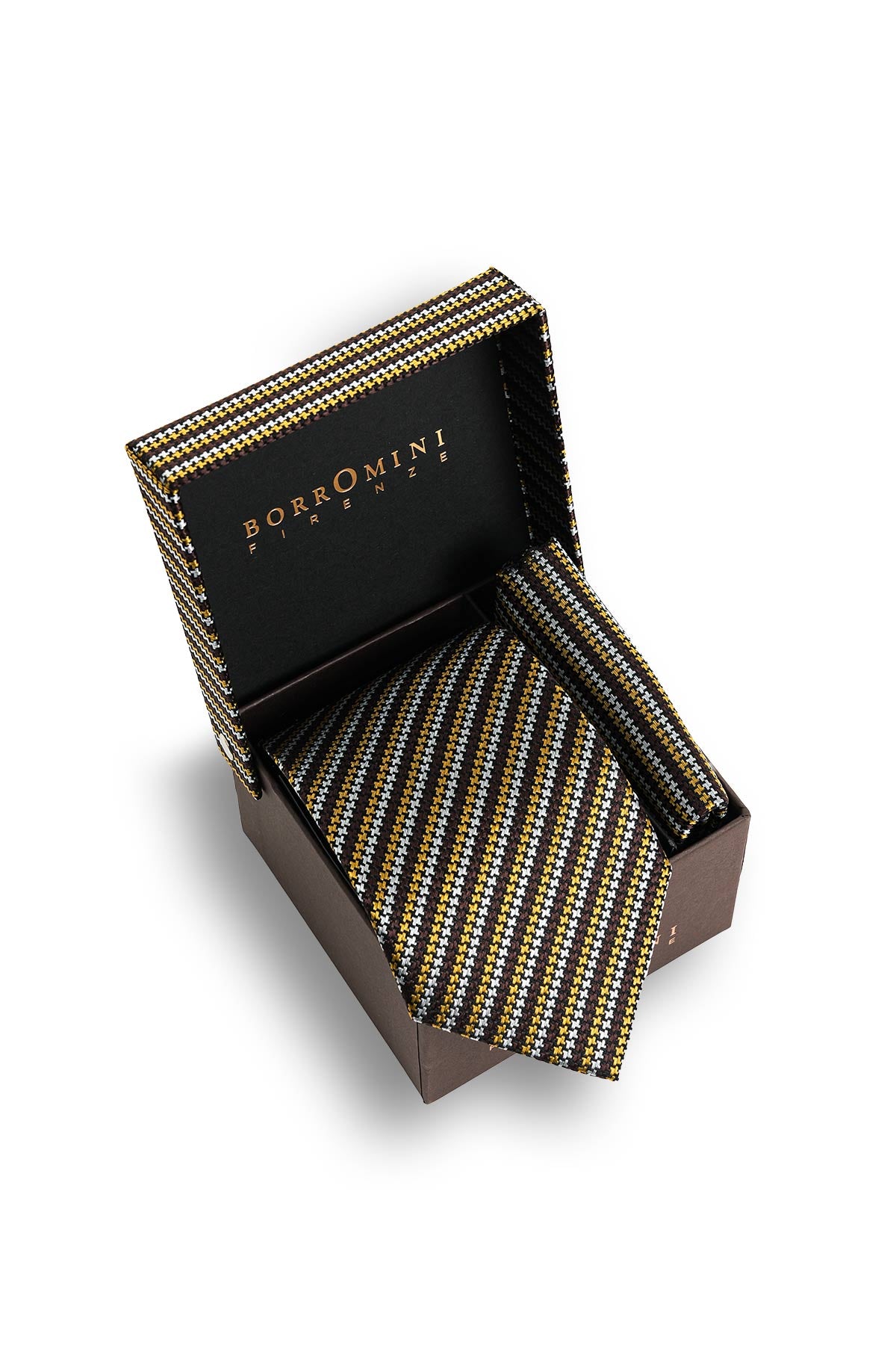 Featuring bold hues and a bold design, this Borromini Firenze pure silk tie comes with a matching pocket square featuring the same refined diagonal stripe pattern. The color combination of black, yellow, white, and gold creates a striking optical effect, perfect for the man who wants to stand out with contemporary elegance. Ideal for completing formal or business outfits, this set is presented in a rigid, fabric-lined box, making it an excellent gift idea.