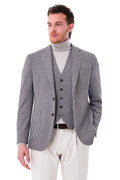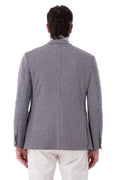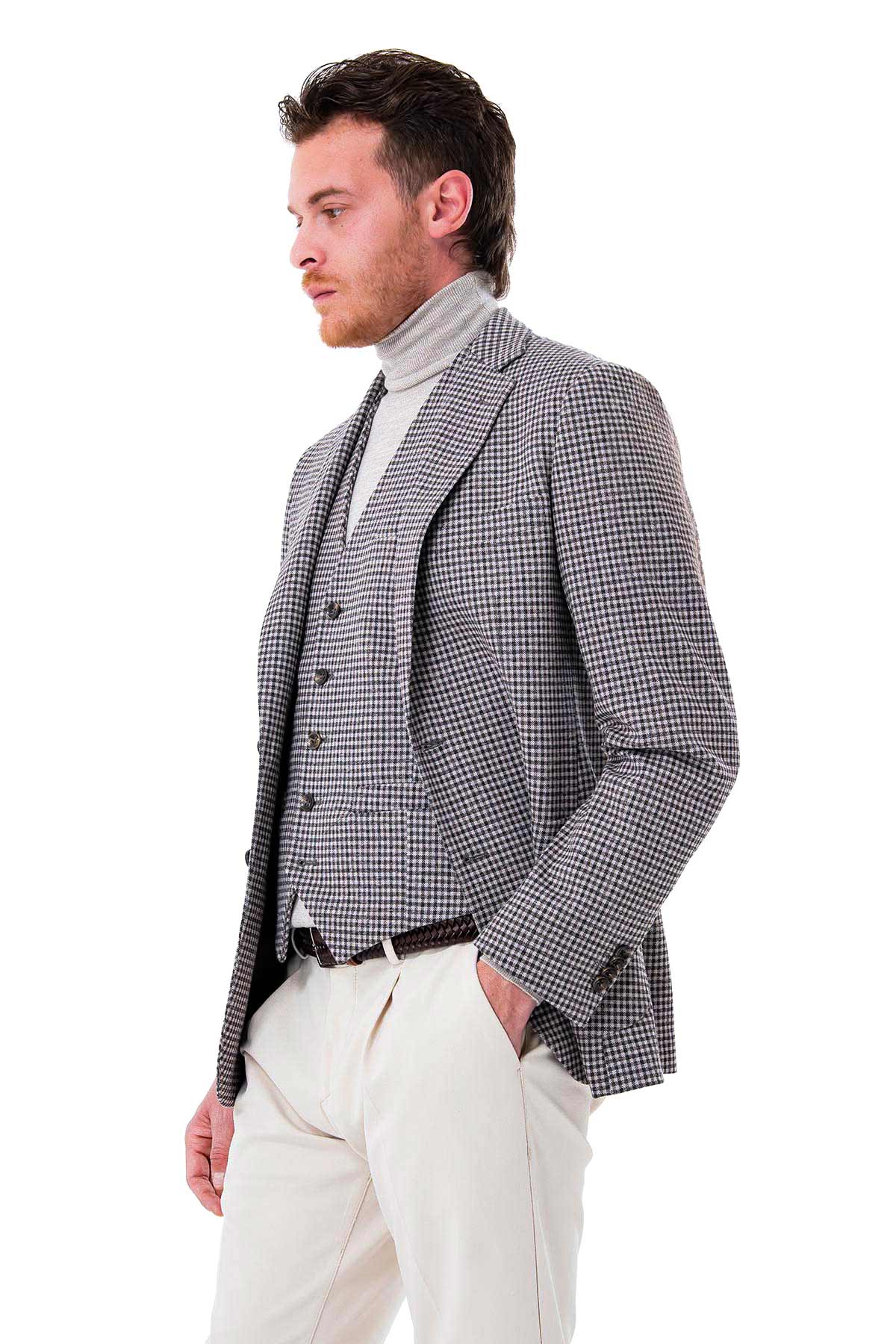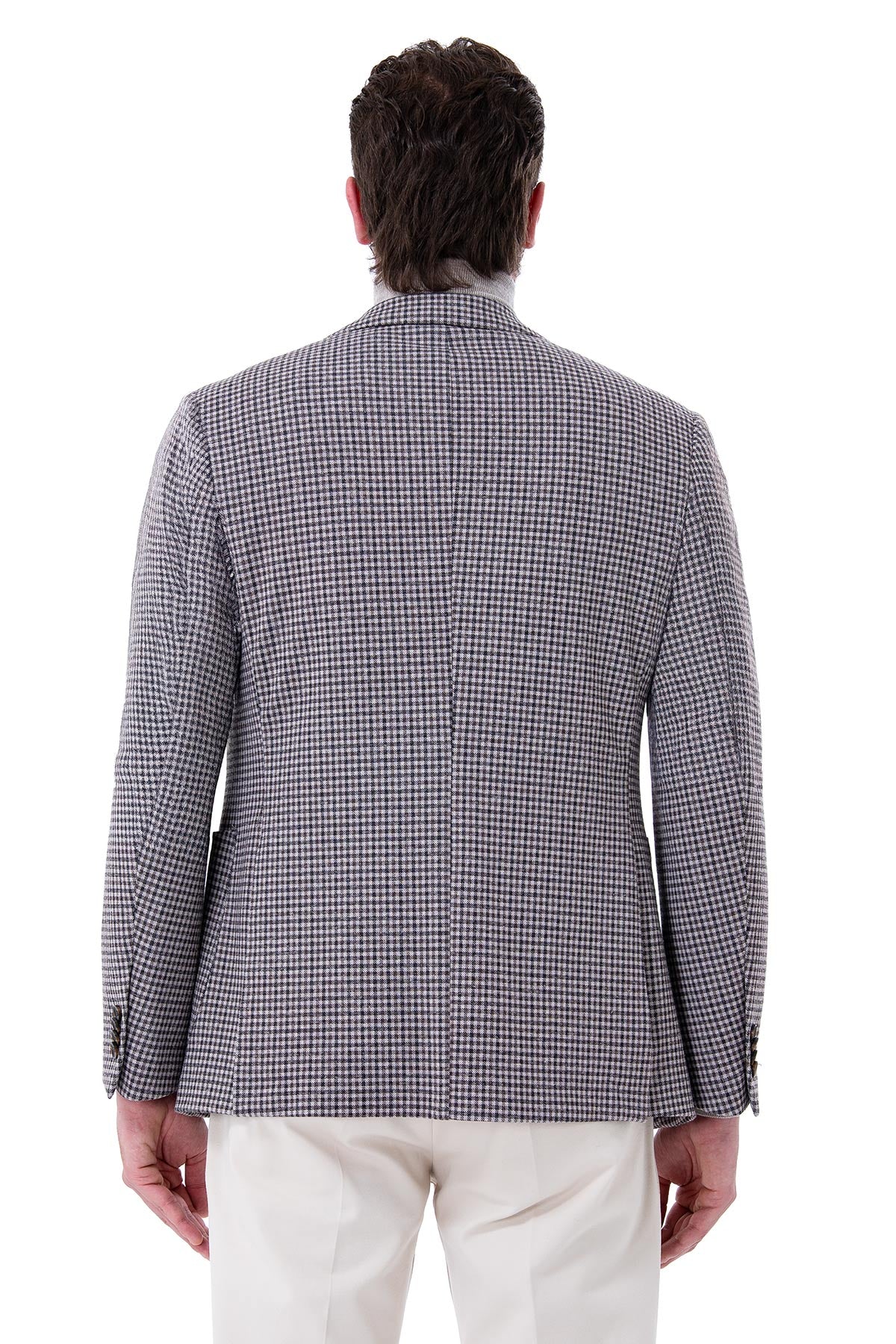 Single-breasted, semi-lined jacket with a beige and blue micro-check pattern, featuring a classic fit and timeless elegance. Crafted from a blend of fabrics for comfort and structure, it's ideal for formal or casual chic outfits. Careful details, front buttons, and patch pockets make this piece refined yet casual, perfect with a turtleneck or shirt.