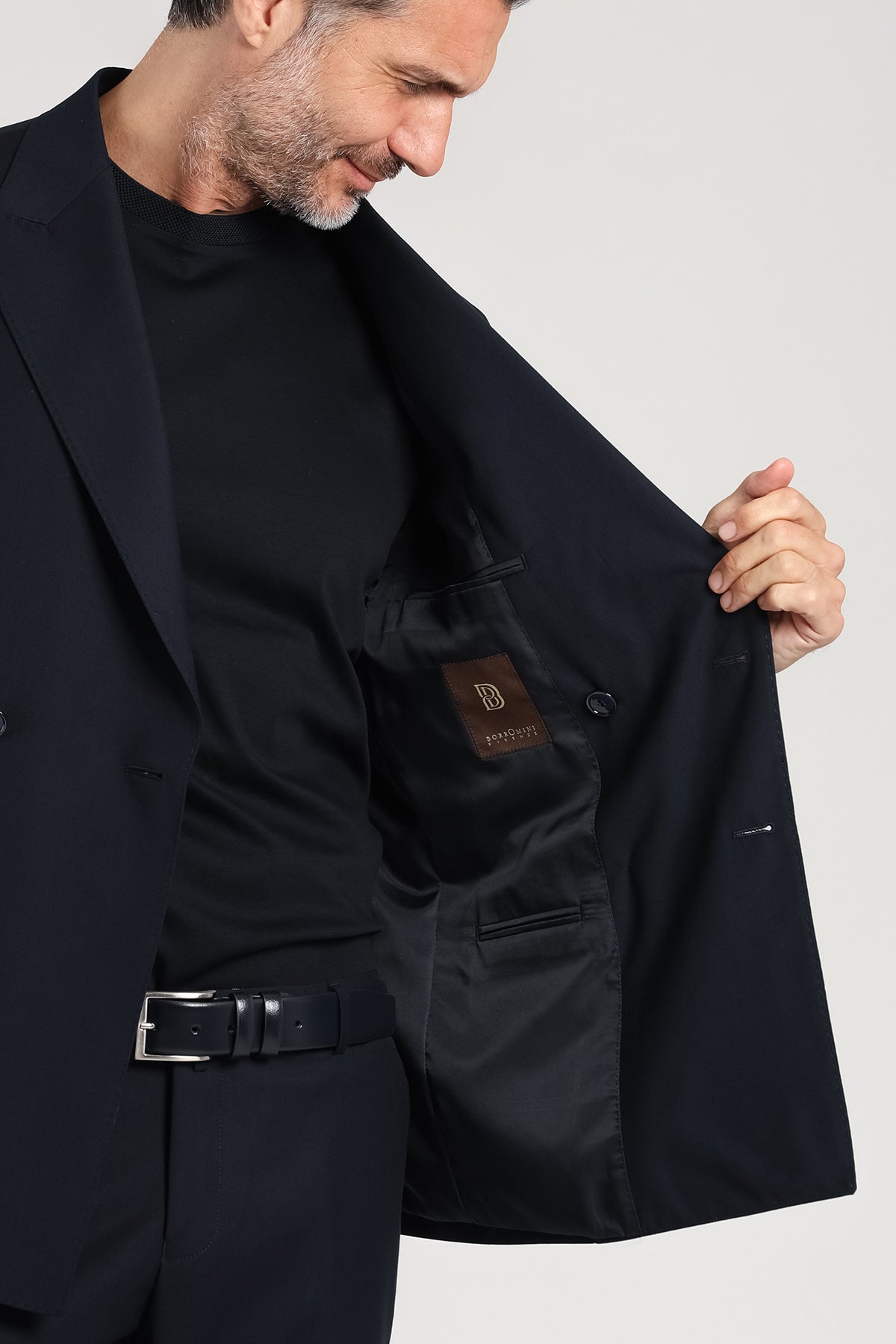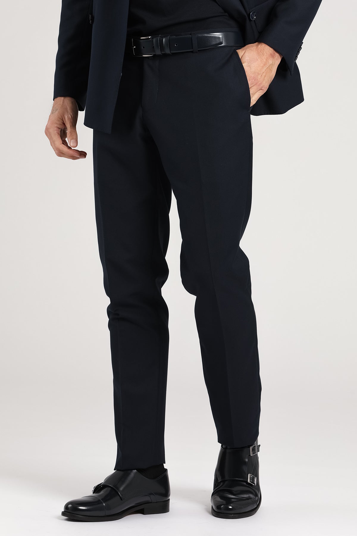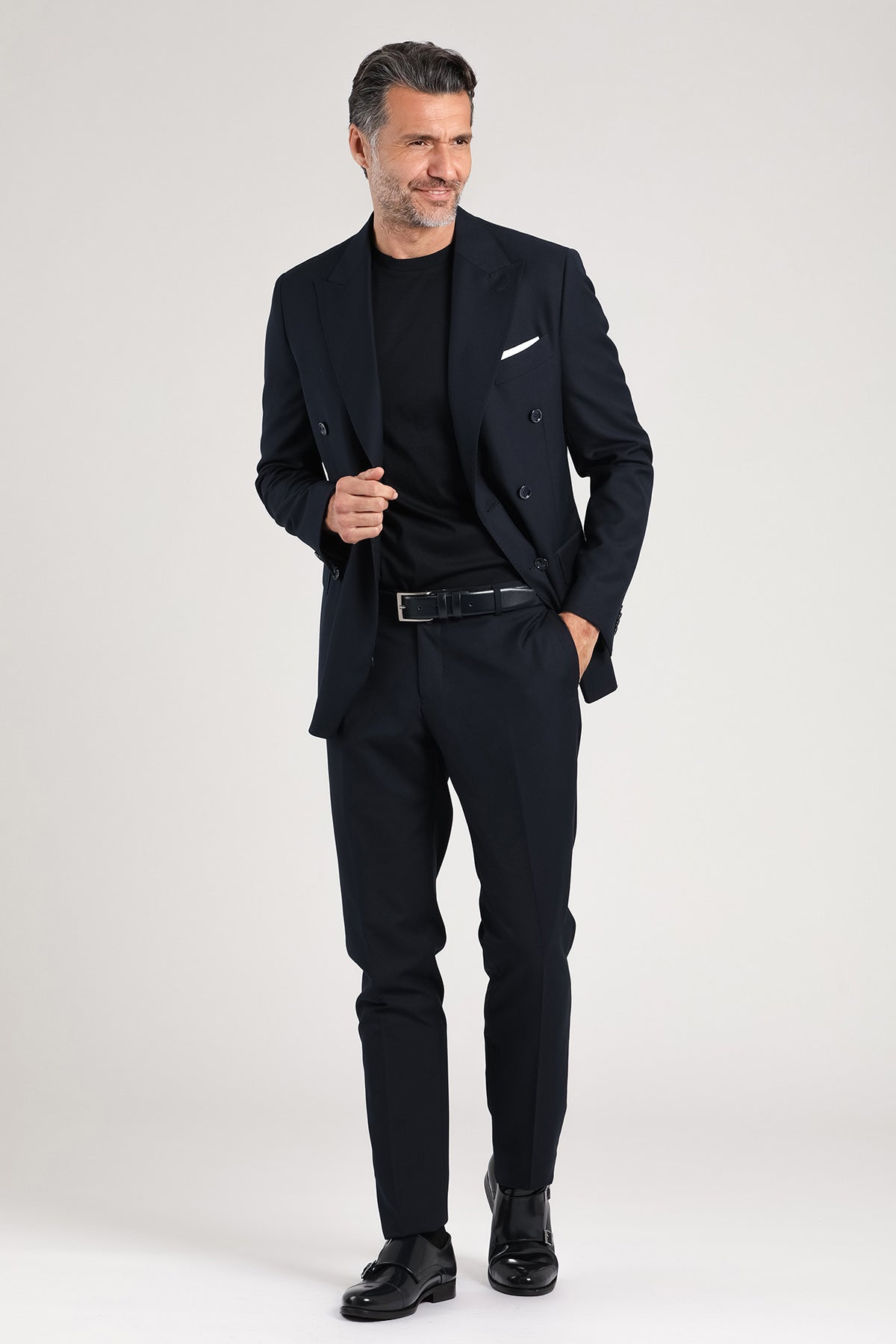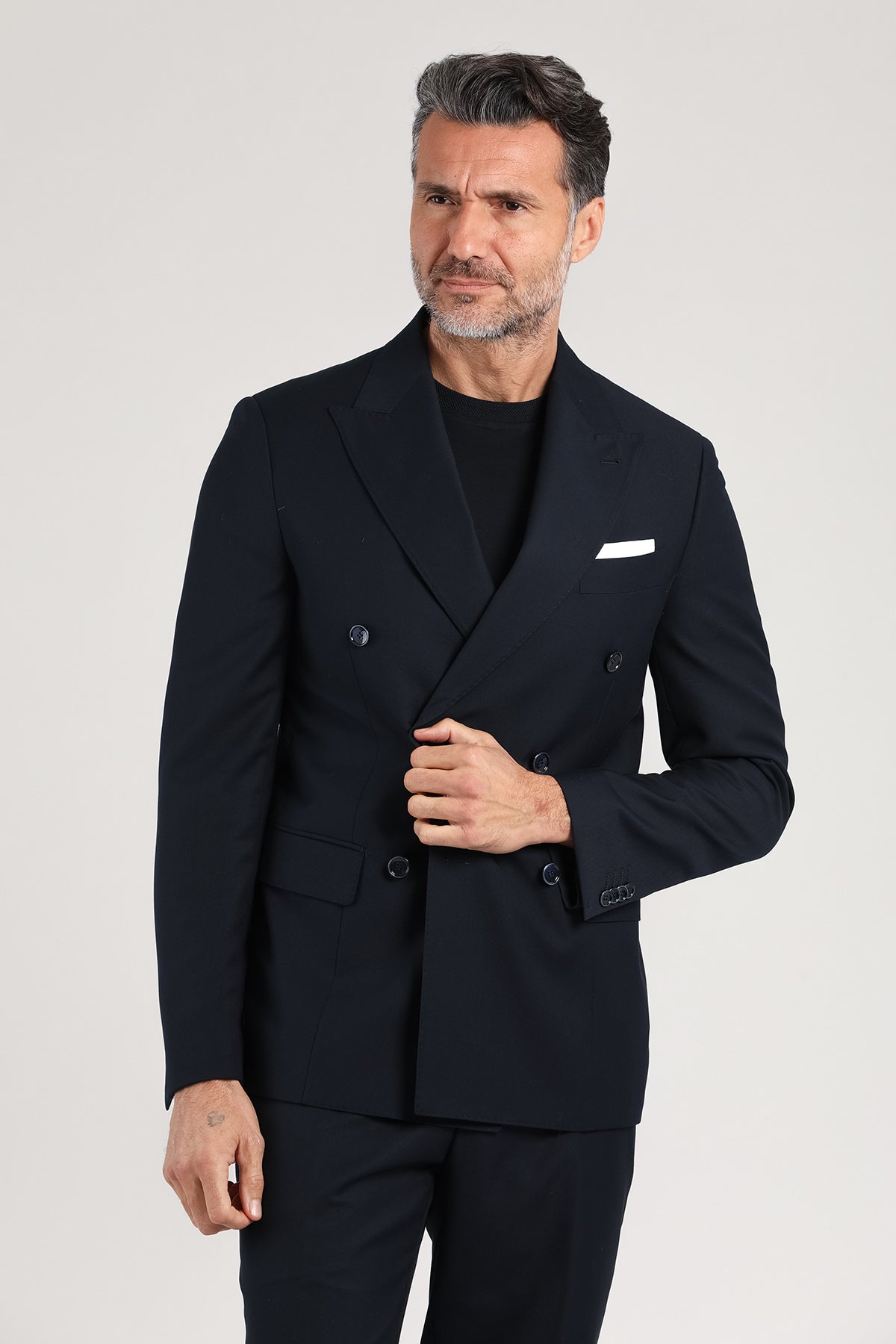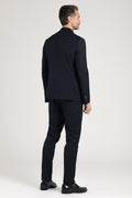 Abito doppiopetto Drop 7 dal carattere deciso e moderno, realizzato in una raffinata miscela di poliestere e viscosa. La silhouette slanciata, con giacca sei bottoni e rever a lancia, esalta il portamento con un’eleganza sobria ma sicura. Il tessuto fluido e confortevole si adatta con naturalezza alla figura, mentre il tono blu scuro lo rende un capo versatile, perfetto per contesti business, serate formali o occasioni eleganti dal tono contemporaneo. Un completo che comunica autorevolezza senza rinunciare allo stile.