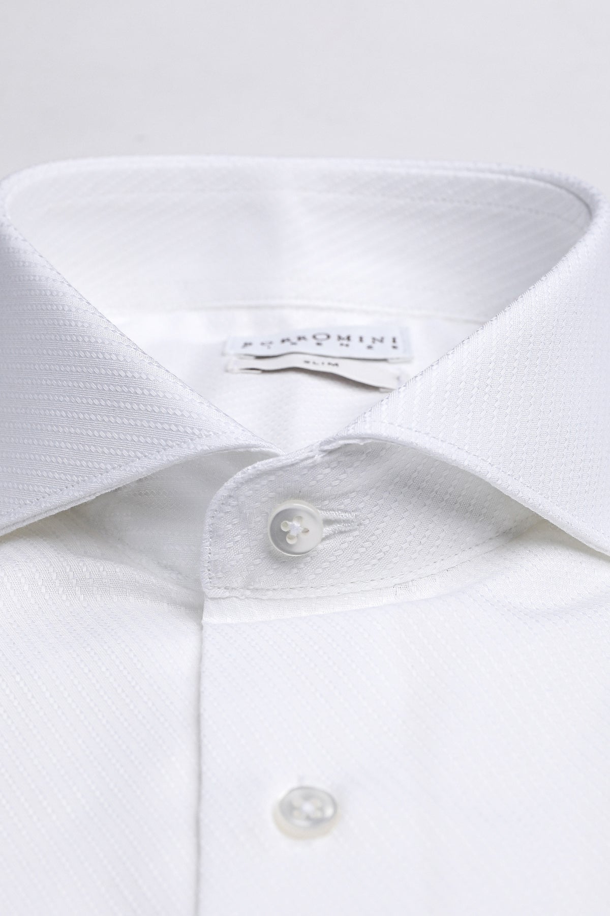 La camicia con collo francese modello FRANCIAQUEEOP-107/700 è caratterizzata da un tessuto pregiato con una trama diagonale micro-jacquard, che alterna linee sottili e delicati dettagli puntinati, conferendo al capo una raffinata eleganza e una texture ricercata. Realizzata in puro cotone al 100%, offre una vestibilità regolare per garantire comfort e praticità in ogni occasione.