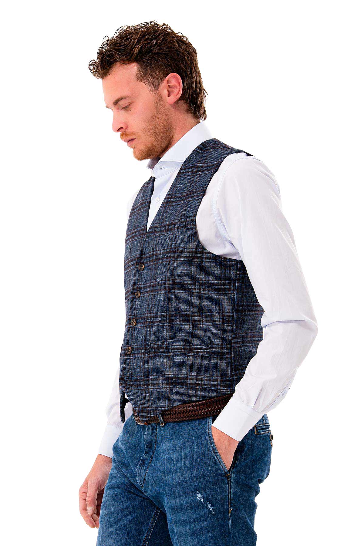 Gilet elegante dalla texture raffinata, realizzato in un tessuto Principe di Galles che combina comfort e carattere contemporaneo. Il design presenta scollo a V, chiusura frontale con bottoni, tasche laterali e martingala regolabile sul retro per un fit personalizzato. Ideale da indossare sopra una camicia per un look sofisticato, perfetto sia per occasioni formali che per outfit casual ricercati.