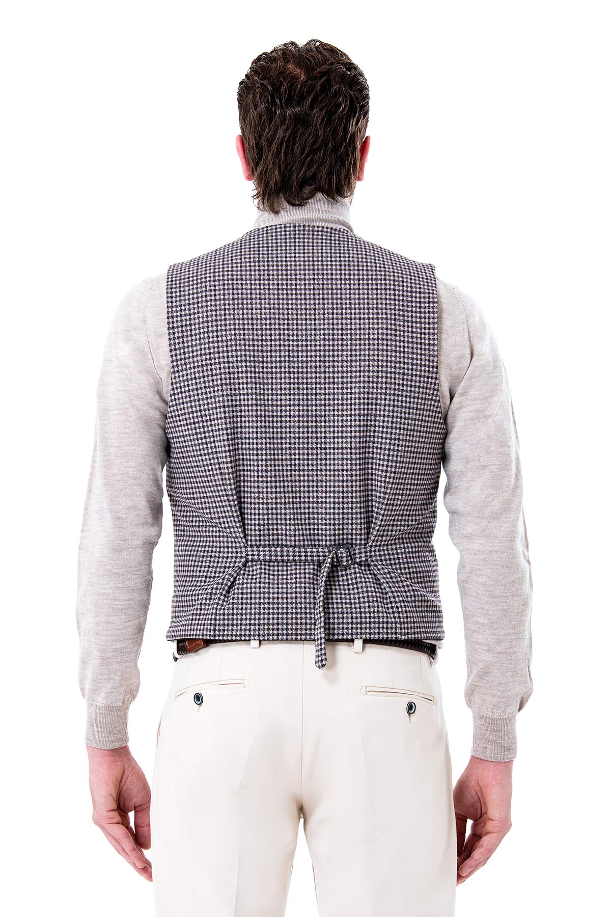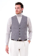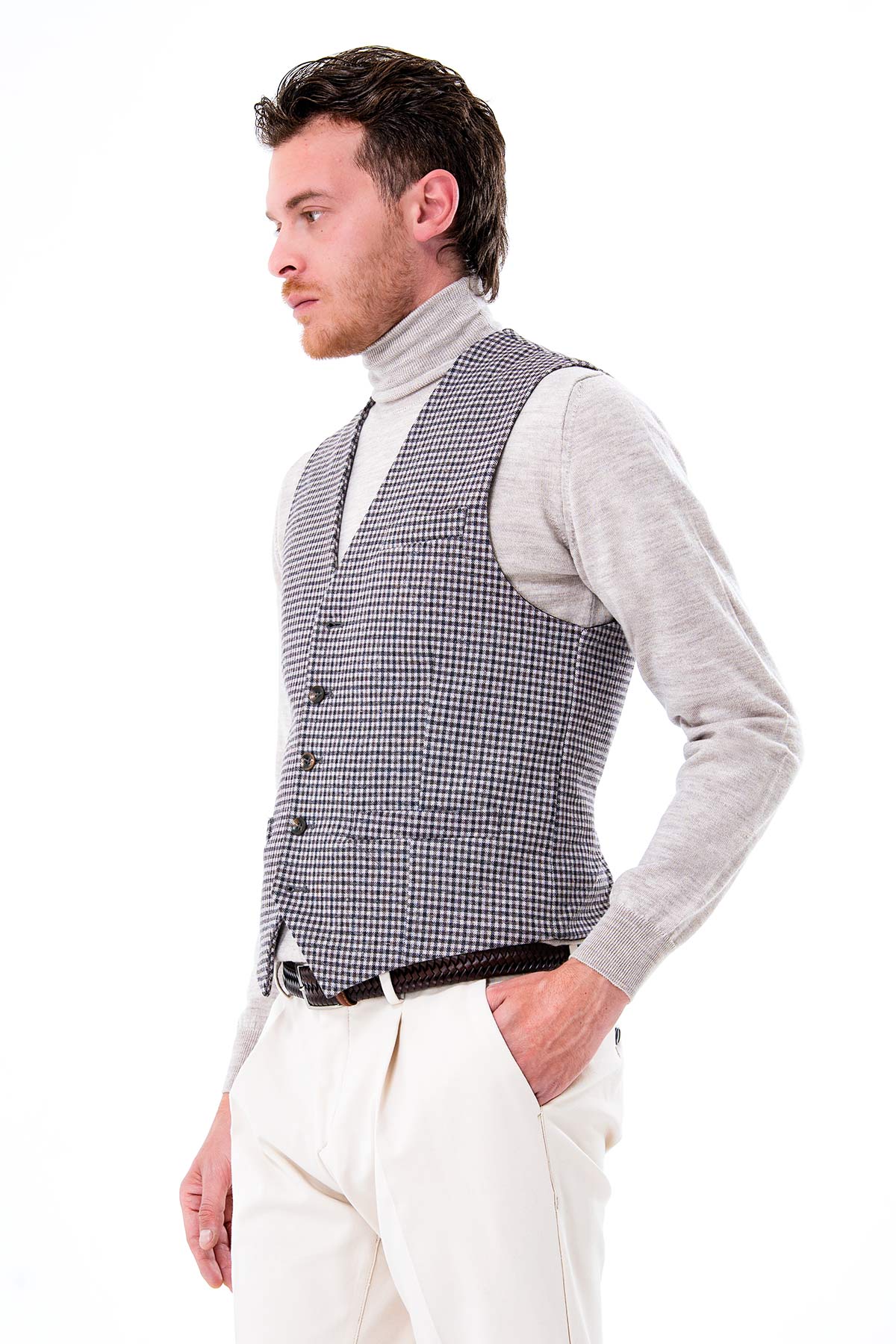Gilet elegante da uomo con motivo pied de poule, realizzato in tessuto misto dalle proprietà traspiranti e leggermente elastiche per garantire comfort e libertà di movimento. La costruzione sartoriale prevede scollo a V, chiusura frontale con cinque bottoni, tasche frontali a filetto e martingala regolabile sul retro. Un capo versatile che aggiunge un tocco raffinato e contemporaneo a ogni look, perfetto sotto giacca o indossato sopra un dolcevita.